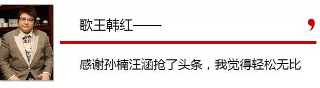 韓紅:第一我不上網,我不知道這些你所闡述的東西。第二在我看來,他用不著上頭條。他是一個老的一線一哥,他用上頭條嗎?上頭條幹嘛呀?博關註度幹嘛呀?照樣還是沒有演出我們現在,這是一個事實。音樂界、唱片界、演出市場界就是如此。所以紅幹嘛呀?紅得沒有意義。我反而要感謝他,感謝汪涵,因為他們兩個搶瞭頭條之後,使得我覺得我自己輕松無比。因為沒把話筒給我,我謝謝大傢瞭,因為我也不知道說什麼。