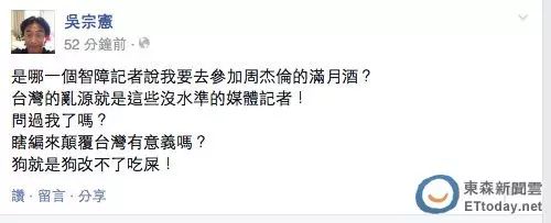 被打臉的吳宗憲又被媒體追問到火大,他在網上怒回,「是哪一個智障記者說我要去參加周傑倫的滿月酒?臺灣的亂源就是這些沒水準的媒體記者!問過我瞭嗎?瞎編來顛覆臺灣有意義嗎?狗就是狗改不瞭吃屎!」